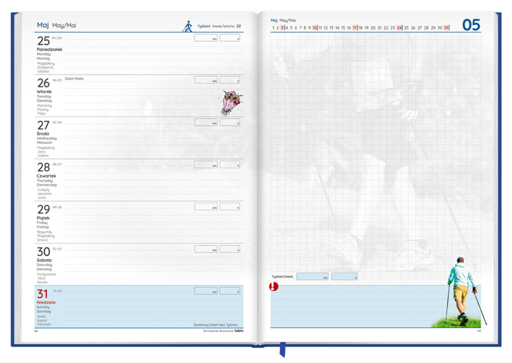 Terminarz został przygotowany w wygodnym formacie B5 z układem „tydzień na rozkładówce” oraz miejscem na notatki, co pozwala na szczegółowe zapisywanie planów marszowych i własnych obserwacji. W kalendarzu znajdziesz również dziennik startów, który ułatwia śledzenie udziału w zawodach i wydarzeniach nordic walking, oraz rejestr sprzętu: kijków (model, długość), grotów, nakładek, pasków/rękawiczek i obuwia — dzięki czemu łatwiej kontrolować zużycie i zaplanować wymianę elementów.